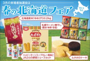 与次郎の総合住宅展示場 南日本ハウジングプラザでは 3月末まで「春の北海道フェア」と題した抽選会を開催中! モデルハウスご見学のうえアンケートにお答えいただくと 「北海道産米ゆめぴりか」「ルタオのケーキ」 「札幌ラーメン」「ハッピーターンスープカレー風味」などが当たります! この機会にぜひご見学にお越しください。